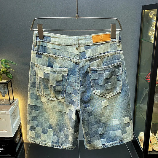 Fashionable high-end denim shorts for men's summer street trend mosaic embroidery print retro loose five quarter pants